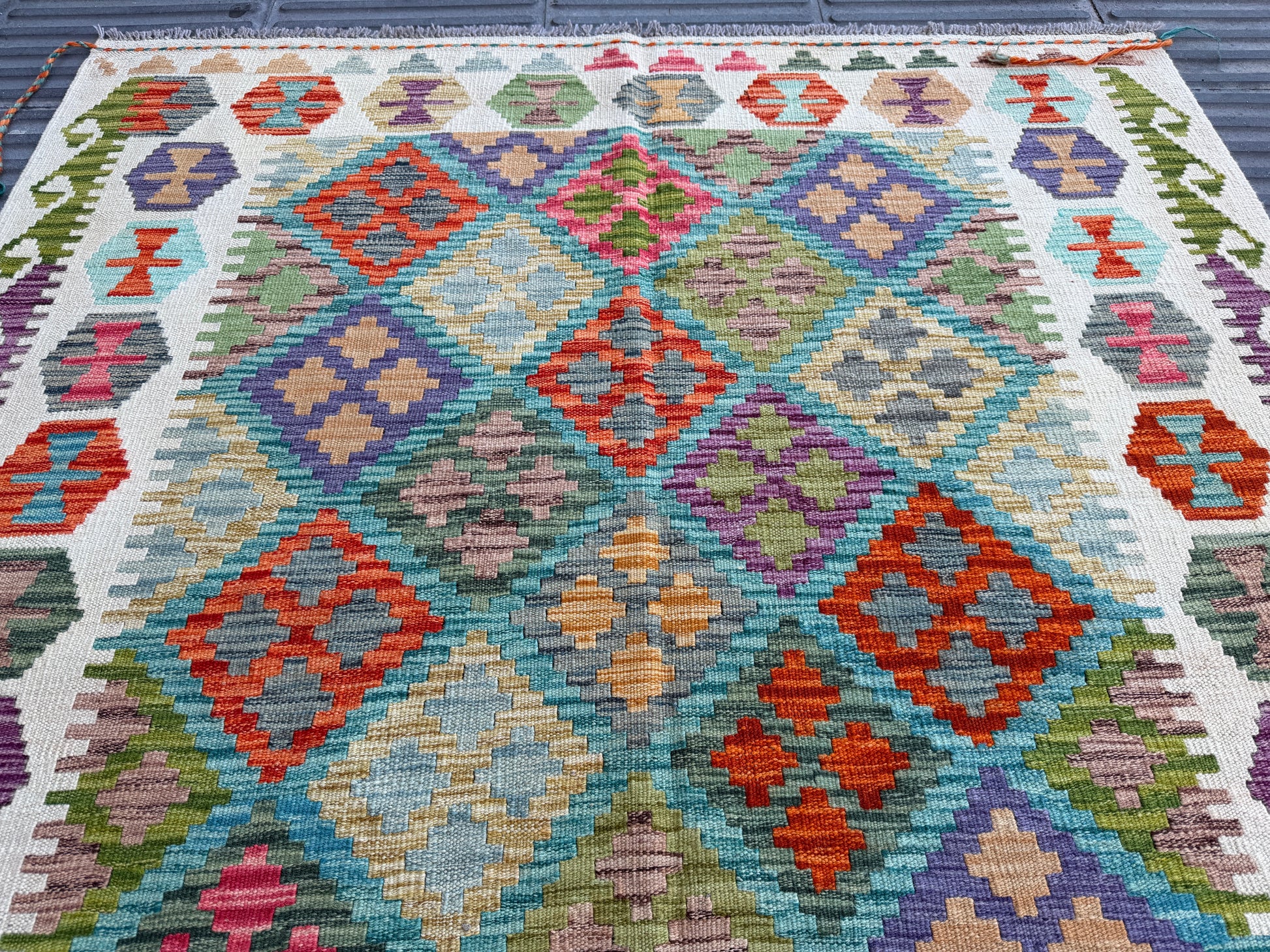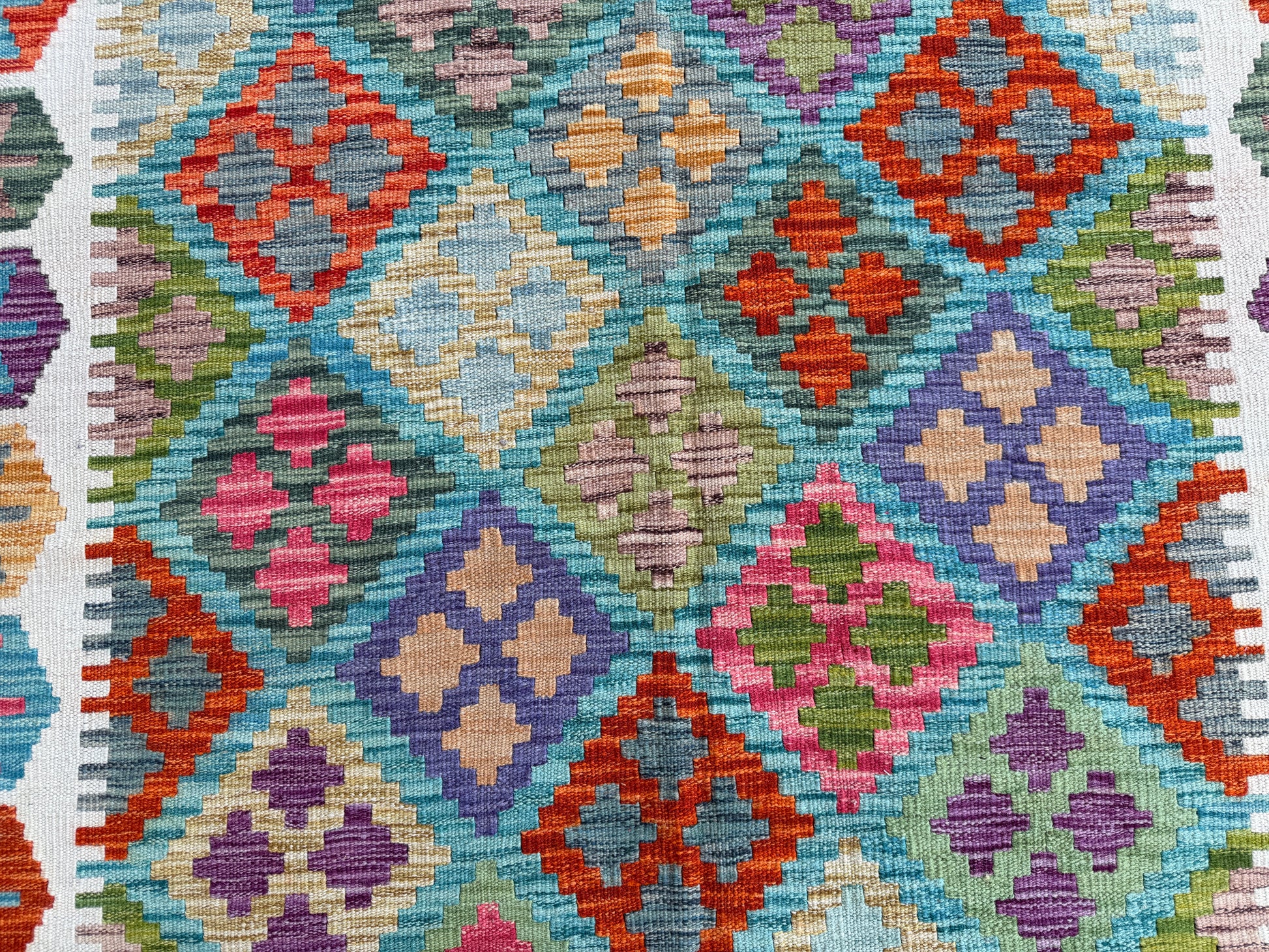 Stunning maimana geometric design hand made kilim will look beautiful on a wooden floor, tile floor or even on the wall.