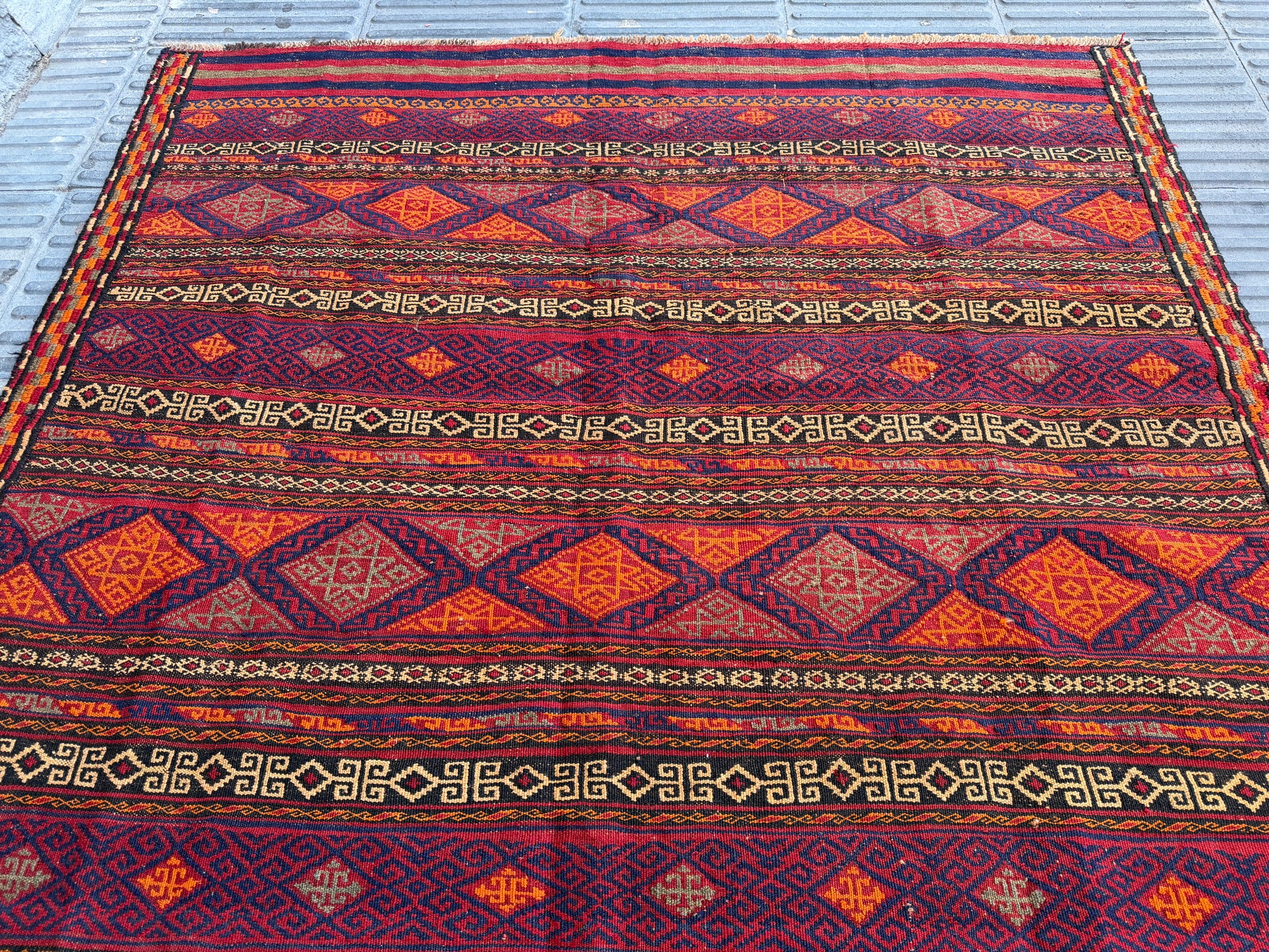 Stunning maimana geometric design hand made kilim will look beautiful on a wooden floor, tile floor or even on the wall.