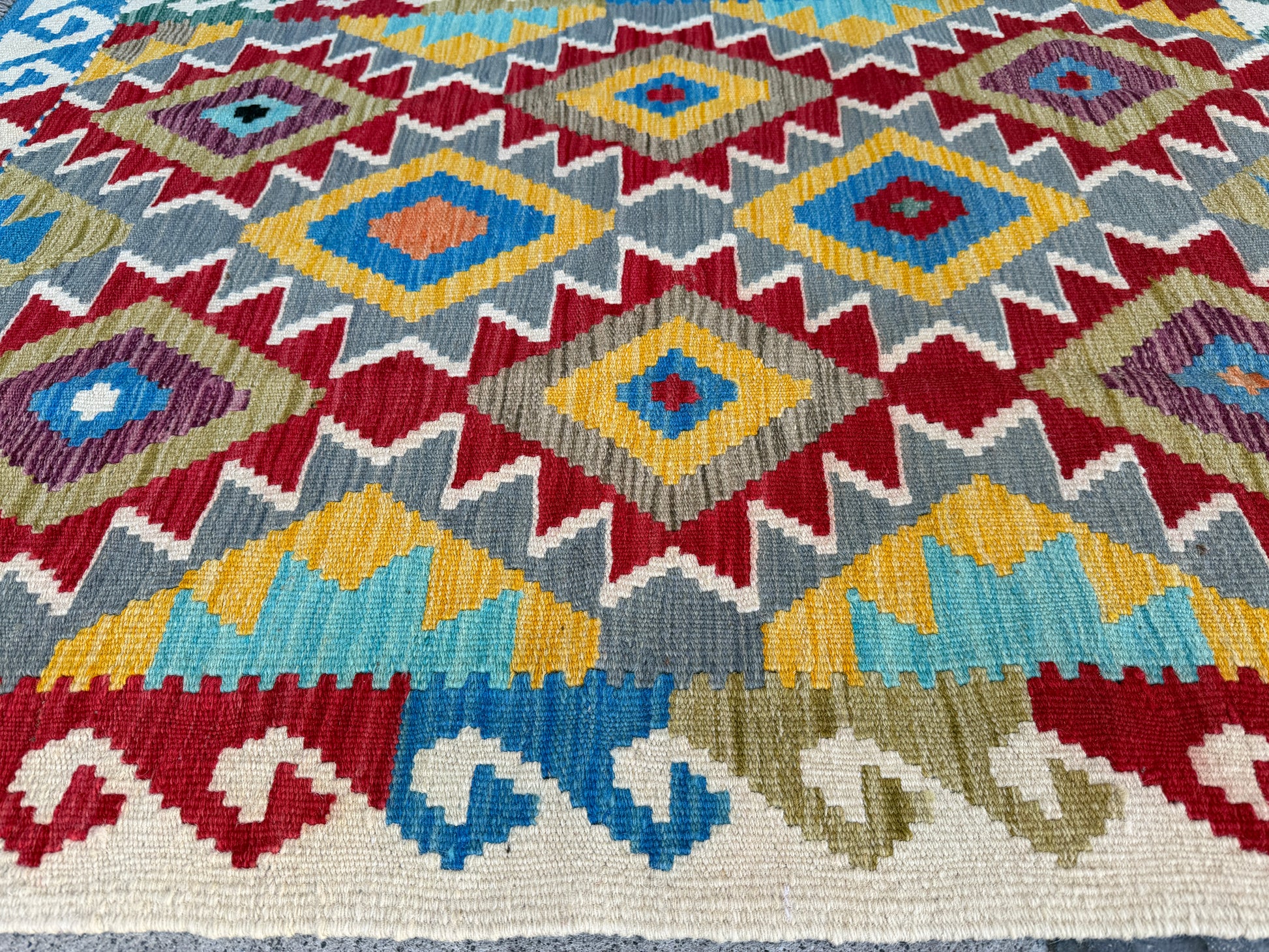 Stunning maimana geometric design hand made kilim will look beautiful on a wooden floor, tile floor or even on the wall.